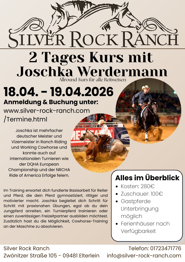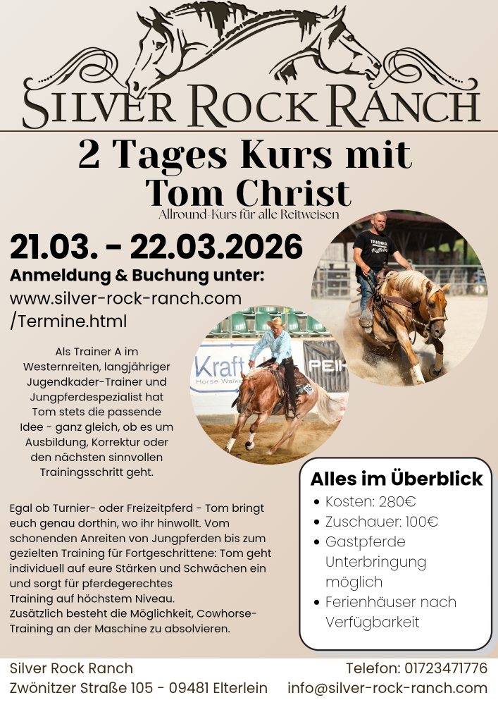 TrainingswochenendeEgal ob Turnier- oder Freizeitpferd, Tom holt euch dort ab, wo ihr steht. Besondere Anliegen, schonendes Anreiten von Jungpferden, pferdegerechter Umgang bei jeglicher Art der Trainingsaufträge- Tom arbeitet an euren Stärken und Schwächen.Als Trainer A im Westernreiten, langjähriger Jugendkader- Trainer und Jungpferdespezialist hat er stets die passende Idee, für Training, Ausbildung oder Korrektur.Ein Kurs der absoluten Spitzenklasse – seid gern dabei.